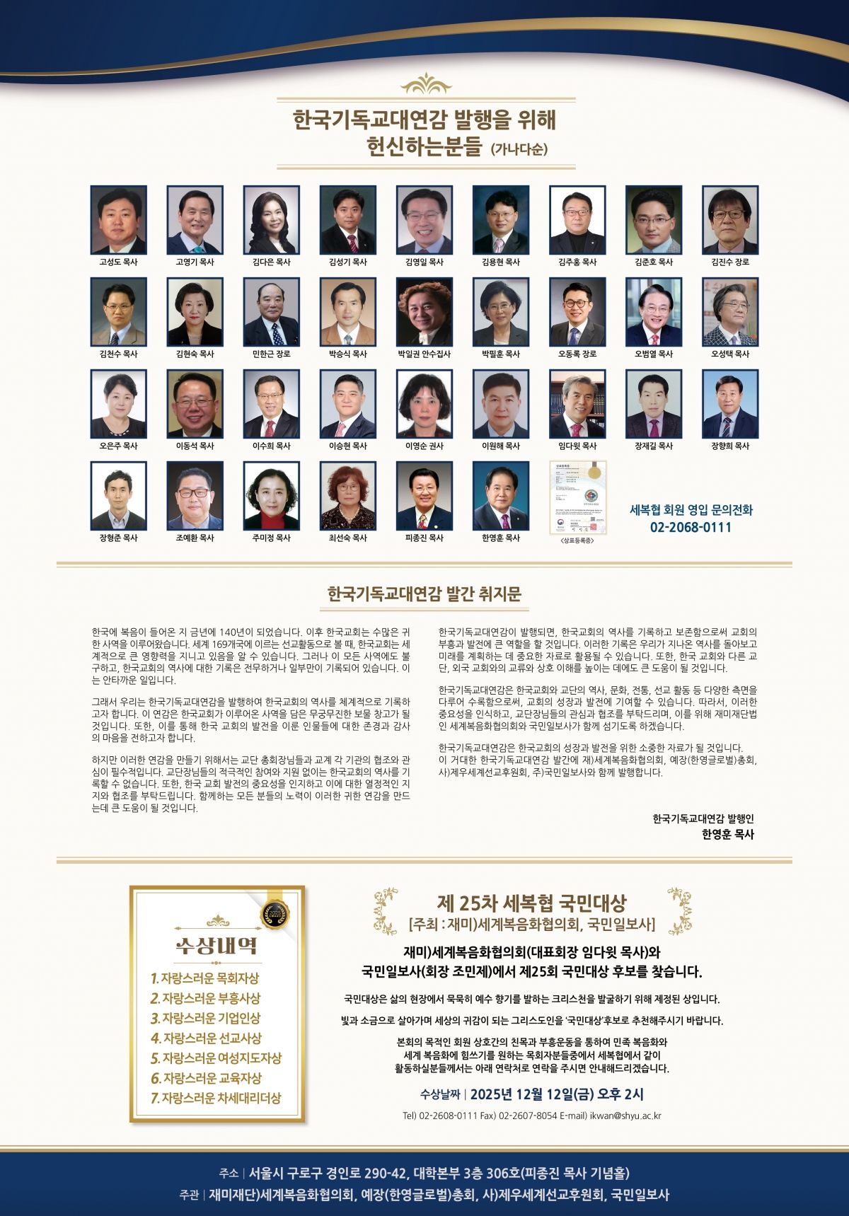 ±¹¹ÎÀϺ¸´Â (Àç)¼¼°èº¹À½ÈÇùÀÇȸ(¼¼º¹Çù¡¤´ëǥȸÀå ÀÓ´ÙÀ ¸ñ»ç)¿Í ÇÔ²² ¡®Á¦25ȸ ±¹¹Î´ë»ó¡¯ È常¦ Ãßõ¹Þ´Â´Ù°í 4ÀÏ ¹àÇû´Ù. ±¹¹Î´ë»óÀº »îÀÇ ÇöÀå¿¡¼ ¹¬¹¬È÷ ¿¹¼öÀÇ Çâ±â¸¦ µå·¯³»´Â Å©¸®½ºÃµÀ» ¹ß±¼Çϱâ À§ÇØ Á¦Á¤µÈ »ó