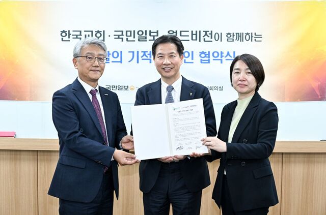 춘천동부교회(김한호 목사·가운데)와 월드비전(회장 조명환) 국민일보(사장 김경호)가 12일 서울 여의도 국민일보 대회의실에서 에스와티니 어린이를 돕는 ‘밀알의 기적’ 캠페인 협약을 맺었다. 김한호 목사는 “우리 교회가 해 온 섬김의 사역을 아프리카까지 확장하게 돼 감사하다”며 “지역과 세계를 섬기는 디아코니아의 마음을 더 많은 이들과 나누는 기회가 되길 바란다”고 말했다.
