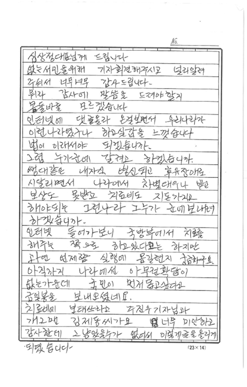 ÇÏÁö¸¸ ÇÑ ´ÞÀÇ ½Ã°£ÀÌ Áö³µÁö¸¸ ¹Î°£º´¿ø Ä¡·áºñ¿¡ ´ëÇÑ ±¸Ã¼Àû Á¶Ä¡°¡ ÀÌ·ïÁöÁö ¾Ê°í ÀÖ´Â °ÍÀ¸·Î ¹àÇôÁ³´Ù. Á¤ÀÇ´çÀº 15ÀÏ °û Áß»çÀÇ ¾î¸Ó´Ï·ÎºÎÅÍ ½É ´ëÇ¥¿¡°Ô ¿Â µÎ ¹øÂ° ÆíÁö¸¦ °ø°³Çß´Ù. ÆíÁö¿¡ µû¸£¸é °û Áß»çÀÇ ¾î¸Ó´Ï¿¡°Ô ¹Î°£º´¿ø Ä¡·áºñ 750¸¸¿øÀ» Àü´ÞÇÑ »ç¶÷Àº °³±×¸Ç ±èÁ¦µ¿¾¾¿Í ÁÖÁø¿ì ½Ã»çÀÎ ±âÀÚ¿´´Ù. °û Áß»çÀÇ ¾î¸Ó´Ï´Â ÆíÁö¿¡¼ ¡°¹ÞÁö ¾ÊÀ¸·Á°í Çߴµ¥ ±¹¹ÎÀÇ µ½°í ½ÍÀº ¸¶À½ÀÌ´Ï º¸ÅÆÀÌ µÆÀ¸¸é ÁÁ°Ú´Ù°í Çϼż ¹Þ¾Ò´Ù¡±¸ç ¡°±¹°¡¿¡¼ ¹Þ¾Æ¾ß µÉ °ÍÀ» ±¹¹Î¿¡°Ô Æó¸¦ ³¢Ä¡´Â °Í °°¾Æ Á¤¸» Á˼ÛÇß´Ù¡±°í °¨»çÀÇ ¸¶À½À» ÀüÇß´Ù.