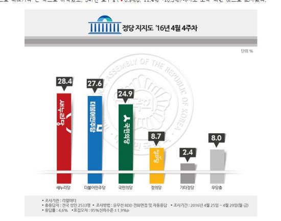 ¸®¾ó¹ÌÅÍ 4¿ù 4ÁÖÂ÷ ÁÖ°£Áý°è(¹«¼± 60%, À¯¼± 40%, Àü±¹ 2,533¸í)¿¡¼ Á¤´çÁöÁöµµÀÇ »õ´©¸®´çÀÌ ÁöµµºÎ °³ÆíÀ» µÑ·¯½Ñ ´õ¹ÎÁÖÀÇ ³»È«¿¡ µû¸¥ ¹Ý»çÀÌÀÍÀ¸·Î Áö³ÁÖ 4¿ù 3ÁÖÂ÷ ÁÖ°£Áý°è ´ëºñ 0.3%p ¿À¸¥ 28.4%·Î ´õ¹ÎÁÖ¸¦ Á¦Ä¡°í 1À§¸¦ ȸº¹ÇÑ °ÍÀ¸·Î ³ªÅ¸³µ´Ù.
