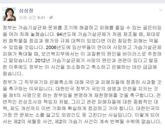 ½É»óÁ¤ Á¤ÀÇ´ç ´ëÇ¥´Â 21ÀÏ ÀÚ½ÅÀÇ ÆäÀ̽ººÏÀ» ÅëÇØ "Á¤ºÎ´Â °¡½À±â»ì±ÕÁ¦ ¹®Á¦¸¦ Á¶±â¿¡ ÇØ°áÇϰí ÇÇÇØ¸¦ ÁÙÀÏ ¼ö ÀÖ´Â °ñµçŸÀÓÀ» ¿©·¯ Â÷·Ê ³õÃÆ½À´Ï´Ù"¶ó°í Çß´Ù.