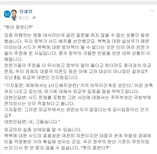 ¿ø ÀÇ¿øÀº "¿äÁò À¯ÇàÇÏ´Â ¿µÈ ´ë»ç¶ó´Âµ¥ °°Àº Áú¹®À» ÇÏÁö ¾ÊÀ» ¼ö ¾ø´Â »óȲÀÌ ¹ß»ý Çß½À´Ï´Ù"¶ó¸ç "¿ì¸® Á¤ºÎ°¡ »çµå ¹èÄ¡¸¦ ¼±¾ðÇß±º¿ä"¶ó°í Çß´Ù.