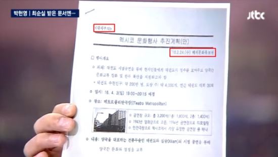 ¹Ú Àü °úÀåÀº Áö³ 9ÀÏ JTBC ´º½º·ë¿¡ Ãâ¿¬ÇØ ¹Ú±ÙÇý ´ëÅë·ÉÀÇ ¼ø¹æ°èȹÀÌ ´ã±ä Á¤ºÎ ºñ¹Ð¹®¼¸¦ °ø°³Çß´Ù. ¹®¼ÀÇ Ãâó´Â ÇØ¿Ü¹®ÈÈ«º¸¿øÀ¸·Î Áö³ÇØ 4¿ù ¸ß½ÃÄÚ ¼ø¹æ ´ç½Ã ¹Ú ´ëÅë·ÉÀÇ ÀÏÁ¤°ú µ¿¼±ÀÌ ´ã°å´Ù. ¶§¹®¿¡ ÁÂÃø »ó´Ü¿¡ ¡®´ë¿ÜÁÖÀÇ¡¯¶ó°í Ç¥±âµÈ ±ØºñÀÚ·á´Ù. ¹Ú Àü °úÀåÀº ¹®¼¸¦ °ø°³ÇÏ¸ç ¡°ÃÖ¼ø½Ç¾¾°¡ űǵµ ½Ã¹ü´ÜÀ» Àç´ÜÆÀÀ¸·Î ±³Ã¼Çß´Ù¡±°í ¸»Çß´Ù.