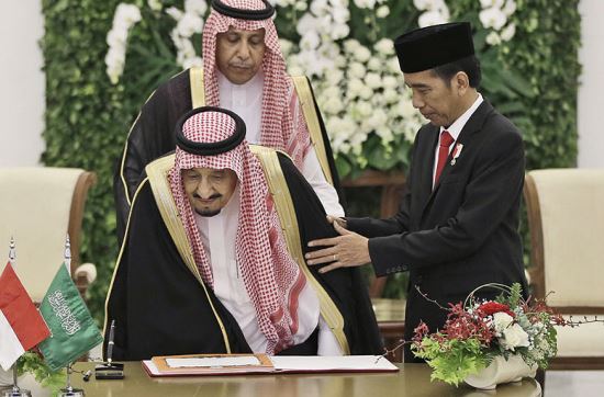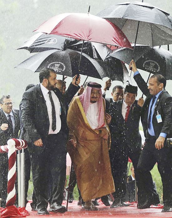 »ì¸¸ ºó ¾ÐµÑ¾ÆÁöÁî ¾Ë»ç¿ìµå »ç¿ìµð¾Æ¶óºñ¾Æ ±¹¿ÕÀÌ 1ÀÏ Àεµ³×½Ã¾Æ º¸°í¸£¿¡ ÀÖ´Â ´ëÅë·É±Ã¿¡ µµÂøÇØ ¼öÇà¿øµéÀÌ ¹ÞÃÄÁÖ´Â ¿ì»êÀ¸·Î ºñ¸¦ ÇÇÇÏ¸ç ¹ß°ÉÀ½À» ¿Å±â°í ÀÖ´Ù. »ì¸¸ ±¹¿Õ °ç ¿À¸¥ÂÊ¿¡ ¸ðÀÚ ¾´ ÀÌ´Â Á¶ÄÚ À§µµµµ Àεµ³×½Ã¾Æ ´ëÅë·É.