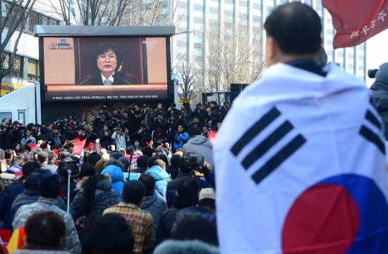 Çå¹ýÀçÆÇ°ü 8¸í Àü¿øÀÌ ÀÇ°ß ÀÏÄ¡·Î ¹Ú±ÙÇý ´ëÅë·ÉÀÇ ÆÄ¸éÀ» °áÁ¤ÇÑ 10ÀÏ ¼¿ï Á¾·Î±¸ ¾È±¹¿ª Àαٿ¡ ¸ðÀÎ ½Ã¹ÎµéÀÌ ÅºÇÙ ¼±°í¸¦ ¹æ¼ÛÀ¸·Î ÁöÄѺ¸°í ÀÖ´Ù. ÀÌ·Î½á ¹Ú ´ëÅë·ÉÀº ´ëÇѹα¹ ÇåÁ¤ »ç»ó ÃÖÃÊ·Î ÆÄ¸éµÈ ´ëÅë·ÉÀ¸·Î ³²°Ô µÆ´Ù.