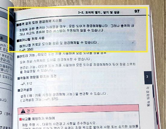 ¹®Á¦´Â Åä¿äŸ°¡ Çѱ¹ ½ÃÆÇÂ÷·®¿¡¼´Â Àá±ÝÇØÁ¦ ½Ã½ºÅÛÀ» »©³õ°í ÇÑ±Û ¸Å´º¾ó¿¡¼´Â ¹öÁ£ÀÌ ¼Ò°³Çϰí ÀÖ´Ù´Â Á¡ÀÌ´Ù. Åä¿äŸ°¡ Â÷·® ±¸¸ÅÀڵ鿡°Ô ³ª´²ÁØ ¸Å´º¾ó 97ÆäÀÌÁö ¡®°¢ ÀåÄ¡ÀÇ ÀÛµ¿¡¯ Ç׸ñÀ» º¸¸é Àá±ÝÇØÁ¦ ½Ã½ºÅÛ¿¡ ´ëÇÑ ¼³¸íÀÌ ÀûÇô ÀÖ´Ù. ÇØ´ç ¸Å´º¾ó¿¡´Â ¿É¼Ç¿¡ µû¶ó ÀåÄ¡°¡ ¾øÀ» ¼ö ÀÖ´Ù´Â ¼³¸íµµ ¾ø´Ù.