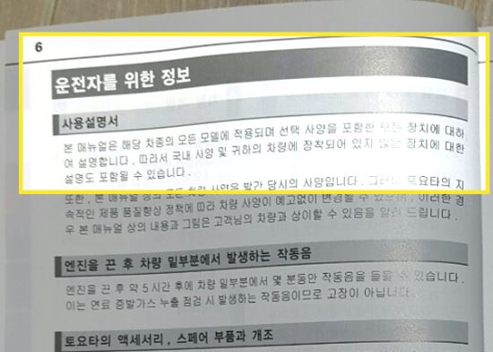 ¹°·Ð Åä¿äŸ°¡ ºüÁ®³ª°¥ ±¸¸ÛÀÌ ¾ø´Â °ÍÀº ¾Æ´Ï´Ù. ¸Å´º¾ó ù Àå ¡®¿îÀüÀÚ¸¦ À§ÇÑ Á¤º¸¡¯(6ÆäÀÌÁö) Ç׸ñ¿¡´Â ¡®±¹³» »ç¾ç ¹× ±ÍÇÏÀÇ Â÷·®¿¡ ÀåÂøµÇ¾î ÀÖÁö ¾ÊÀº ÀåÄ¡¿¡ ´ëÇÑ ¼³¸íµµ Æ÷Ç﵃ ¼ö ÀÖ´Ù¡¯°í ÀûÇô ÀÖ´Ù.