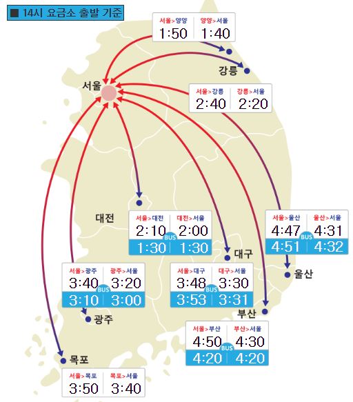 ´ë±¸±îÁö´Â 3½Ã°£48ºÐ, ¸ñÆ÷±îÁö´Â 3½Ã°£50ºÐ, ±¤ÁÖ±îÁö´Â 3½Ã°£40ºÐ, °¸ª±îÁö´Â 2½Ã°£40ºÐ, ¾ç¾ç±îÁö´Â 1½Ã°£50ºÐ, ´ëÀü±îÁö´Â 2½Ã°£10ºÐÀÌ ¼Ò¿äµÉ °ÍÀ¸·Î º¸ÀδÙ.