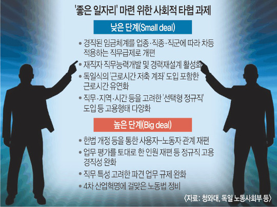 ´Ù¸¸ ¼ø¼´Â ÀÖ´Ù. Á¤ºÎ³ª ³ë»ç°¡ ´çÀå ÀÛ¾÷¿¡ Âø¼öÇÒ ¼ö ÀÖ´Â Á÷¹«¿¡ µû¸¥ ÀÓ±ÝÁ¦ µµÀÔó·³ ¡®³·Àº ´Ü°è(Small deal)¡¯ÀÇ Å¸ÇùÀÌ ¸ÕÀú´Ù. ¹Ì·¡¸¦ À§ÇØ ³ë»ç°¡ ¼·Î ¾çº¸ÇØ¾ß ÇÒ ´ë±â¾÷-Áß¼Ò±â¾÷ ÀÌÁß±¸Á¶ ÇØ°á°ú °°Àº ¡®³ôÀº ´Ü°è(Big deal)¡¯ÀÇ Å¸ÇùÀº ½Ã°£À» µéÀÏ Çʿ䰡 ÀÖ´Ù. ´Ü°èÀûÀ¸·Î Çѱ¹¸¸ÀÇ °í¿ë À¯¿¬¼ºÀ» È®º¸ÇØ¾ß ÇÑ´Ù´Â °ÍÀÌ´Ù.