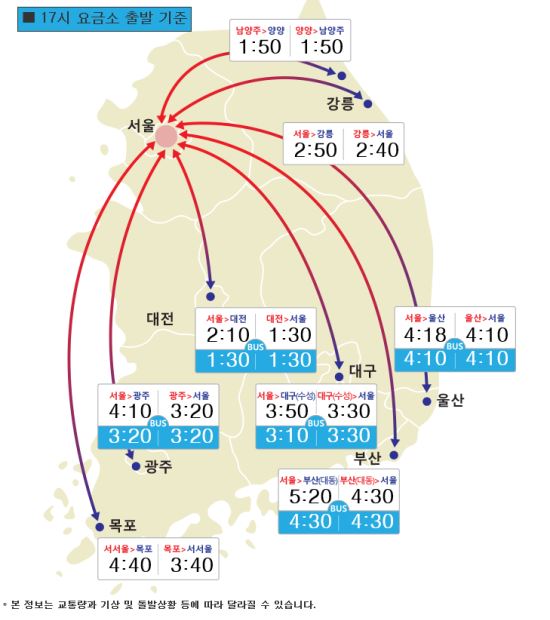¿ÀÈÄ 5½Ã ¼¿ï¿ä±Ý¼Ò¸¦ Ãâ¹ßÇÑ Â÷·®À» ±âÁØÀ¸·Î µµ·Î°ø»ç°¡ ¿¹»óÇÑ ±¸°£º° ¼Ò¿ä½Ã°£Àº ¡®¼¿ï¡æ´ëÀü¡¯ 2½Ã°£10ºÐ ¡®¼¿ï¡æ¿ï»ê¡¯ 4½Ã°£18ºÐ ¡®¼¿ï¡æ±¤ÁÖ¡¯ 4½Ã°£10ºÐ ¡®¼¿ï¡æ´ë±¸¡¯ 3½Ã°£50ºÐ ¡®¼¿ï¡æ¸ñÆ÷¡¯ 4½Ã°£40ºÐ µîÀÌ´Ù.