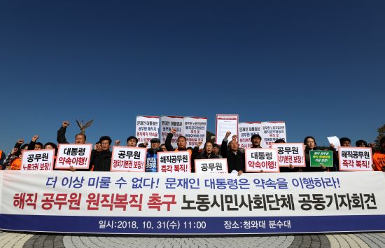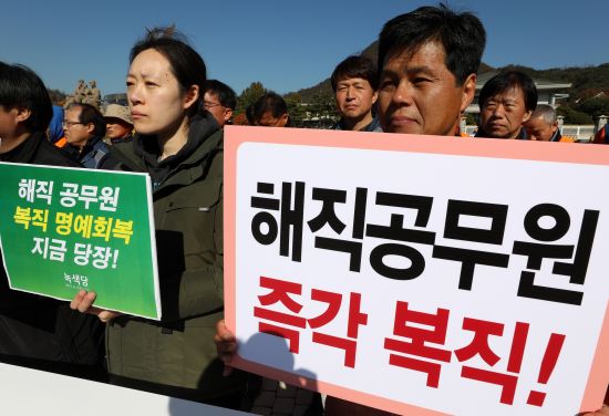 ÇØÁ÷°ø¹«¿ø Áï°¢ º¹Á÷À» ¹Ù¶ó´Â °¢°è ³ëµ¿ ½Ã¹Î »çȸ Áøº¸Á¤´çÀÌ 31ÀÏ Ã»¿Í´ë ºÐ¼ö´ë ¾Õ¿¡¼ 'ÇØÁ÷ °ø¹«¿ø ¿øÁ÷º¹Á÷ Ã˱¸ ³ëµ¿½Ã¹Î»çȸ´Üü °øµ¿±âÀÚȸ°ß'À» Çϰí ÀÖ´Ù.