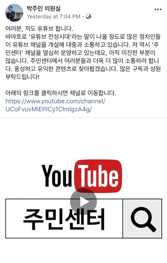 박주민 더불어민주당 의원이 13일 오후 자신의 페이스북에 “여러분, 저도 유튜브 합니다”라며 본인의 유튜브 채널을 스스로 홍보했다.