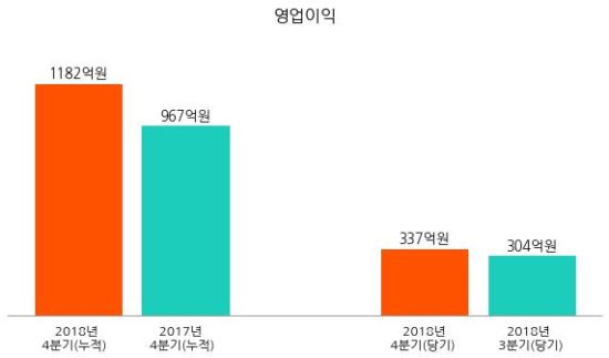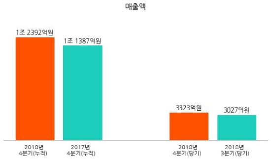 ºÐ±âº° ½ÇÀûÀÇ °æ¿ì 2018³â 4ºÐ±â ¸ÅÃâ¾×Àº 3323¾ï¿øÀ¸·Î µ¿³â 3ºÐ±â ¸ÅÃâ¾× 3027¾ï¿ø ´ëºñ 296¾ï¿ø(9.8%) Áõ°¡Çß´Ù. 2018³â 4ºÐ±â ¿µ¾÷ÀÌÀÍÀº 337¾ï¿øÀ¸·Î µ¿³â 3ºÐ±â ¿µ¾÷ÀÌÀÍ 304¾ï¿ø ´ëºñ 33¾ï¿ø Áõ°¡Çß´Ù.