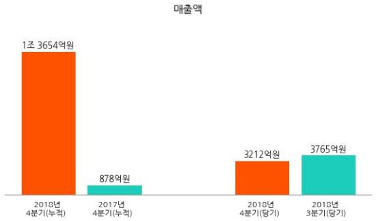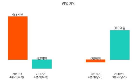 ºÐ±âº° ½ÇÀûÀÇ °æ¿ì 2018³â 4ºÐ±â ¸ÅÃâ¾×Àº 3212¾ï¿øÀ¸·Î µ¿³â 3ºÐ±â ¸ÅÃâ¾× 3765¾ï¿ø ´ëºñ 553¾ï¿ø(-14.7%) °¨¼ÒÇß´Ù. 2018³â 4ºÐ±â ¿µ¾÷¼Õ½ÇÀº 28¾ï¿øÀ¸·Î µ¿³â 3ºÐ±â ¿µ¾÷ÀÌÀÍ 310¾ï¿ø ´ëºñ 338¾ï¿ø °¨¼ÒÇØ ÀûÀÚ·Î ÀüȯµÆ´Ù.