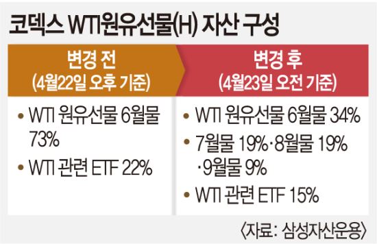 ÅõÀÚÀÚµéÀÌ ¹®Á¦ »ï°í ÀÖ´Â °Ç Å©°Ô µÎ °¡Áö´Ù. ¸ÕÀú »ï¼ºÀÚ»ê¿î¿ëÀÌ ¿ù¹° ±³Ã¼ µî ETF ¿î¿ë ¹æ½ÄÀ» »çÀü °íÁö ¾øÀÌ ÀÓÀÇ·Î º¯°æÇß´Ù´Â Á¡ÀÌ´Ù. »ï¼ºÀÚ»ê¿î¿ëÀº Áö³´Þ 21ÀÏ(ÇöÁö½Ã°£) 6¿ù¹° WTI °¡°ÝÀÌ 43.4% Æø¶ôÇÏÀÚ ÇØ´ç ETF ±¸¼º Á¾¸ñ Áß 6¿ù¹° ºñÁßÀ» Å©°Ô ³·Ãß°í(73%¿¡¼ 34%), ³ª¸ÓÁö´Â 7~9¿ù¹°·Î ±³Ã¼Çß´Ù.