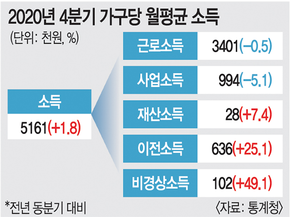 18ÀÏ Åë°èûÀÇ ¡®2020³â 4ºÐ±â °¡°èµ¿Çâ Á¶»ç¡¯¿¡ µû¸£¸é Áö³ÇØ 4ºÐ±â °¡°èÀÇ Æò±Õ ±Ù·Î¼ÒµæÀº 340¸¸1000¿øÀ¸·Î Àü³â µ¿±â ´ëºñ 0.5% ÁÙ¾ú´Ù. 4ºÐ±â ±âÁØÀ¸·Î´Â 2003³â Åë°è ÀÛ¼º ÀÌ·¡ ÃÖ´ë °¨¼ÒÆøÀÌ´Ù. ±Ù·Î¼Òµæ °¨¼Ò ÆøÀº Àú¼ÒµæÃþÀÌ ÄÇ´Ù. ¼Òµæ ÇÏÀ§ 20% °¡°èÀÇ ±Ù·Î¼ÒµæÀº 13.2% ±Þ°¨Çß´Ù. ¹Ý¸é »óÀ§ 20% ±Ù·Î¼ÒµæÀº 1.8% ¿Ã¶ú´Ù.