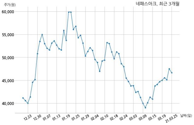 ÇÑÆí, ³×ÆÐ½º¾ÆÅ©ÀÇ 14½Ã 35ºÐ ÇöÀçÁÖ°¡´Â 46,650¿øÀ¸·Î Á÷Àü °Å·¡ÀÏ ´ëºñ 850¿ø(-1.79%) Ç϶ôÀ̸ç, °Å·¡·®Àº 30,493ÁÖÀÌ´Ù.