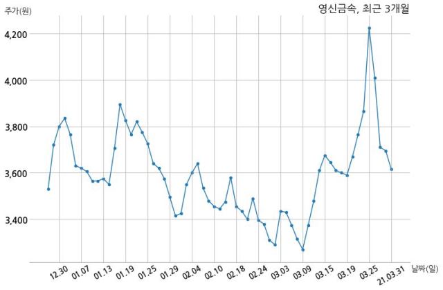 ¿µ½Å±Ý¼ÓÀº ¼±Áö¿µ ¹× Ưº°°ü°èÀÚÀÇ ÁöºÐÀ²ÀÌ 29.19%¿¡¼ 27.19%·Î º¯µ¿Çß´Ù°í 31ÀÏ °ø½ÃÇß´Ù. ÇÑÆí, ¿µ½Å±Ý¼ÓÀº Àå ¸¶°¨ ÀÌÈÄ ÇØ´ç ±â¾÷°ø½Ã¸¦ ¹ßÇ¥ÇßÀ¸¸ç ¿À´Ã Á¾°¡°¡ 3,615¿ø, °Å·¡·®Àº 52,205ÁÖ·Î, Á÷Àü °Å·¡ÀÏ ´ëºñ 80¿ø(-2.17%) Ç϶ôÇß´Ù.