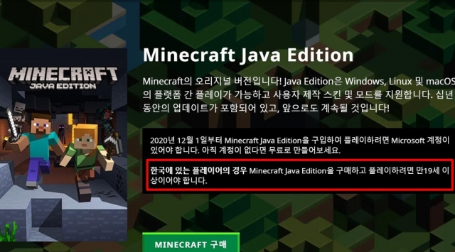5ÀÏ ¾÷°è¿¡ µû¸£¸é ¸¶ÀÌÅ©·Î¼ÒÇÁÆ®´Â ÃÖ±Ù ¸¶ÀÎÅ©·¡ÇÁÆ® ȨÆäÀÌÁö¸¦ ÅëÇØ ¡°Çѱ¹¿¡ ÀÖ´Â Ç÷¹À̾îÀÇ °æ¿ì ¸¶ÀÎÅ©·¡ÇÁÆ® ÀÚ¹Ù ¿¡µð¼ÇÀ» ±¸¸ÅÇϰí ÀÌ¿ëÇÏ·Á¸é ¸¸ 19¼¼ ÀÌ»óÀ̾î¾ß ÇÑ´Ù¡±°í °øÁöÇß´Ù.