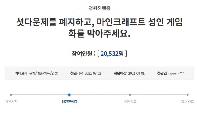 ÃÖ±Ù¿¡´Â °ÔÀÓ ¼Ë´Ù¿îÁ¦¸¦ ÆóÁöÇÏ°í ¸¶ÀÎÅ©·¡ÇÁÆ®°¡ ¼ºÀÎ¿ë °ÔÀÓÀÌ µÇ´Â °É ¸·¾Æ´Þ¶ó´Â ÃëÁöÀÇ Ã»¿Í´ë ±¹¹Îû¿øµµ ¿©·¯ Â÷·Ê ¿Ã¶ó¿Ô´Ù. Áö³ 2ÀÏ¿¡ °ÔÀçµÈ °ü·Ã û¿øÀº ¾à 2¸¸¸íÀÇ µ¿ÀǸ¦ ¾òÀº »óÅ´Ù.