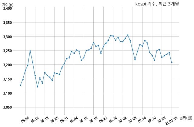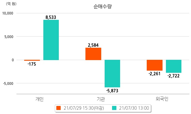 30일 오후 1시 코스피(3,207.68p, -34.97p, -1.08%)는 기관 매도가 늘면서 하락세를 보이고 있다. 투자자별 동향을 살펴보면 기관은 5,873억원 순매도했으며, 외국인도 2,722억원 순매도했다. 개인은 8,533억원 순매수하고 있다.