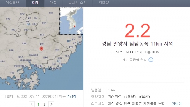 14ÀÏ ¿ÀÀü 3½Ã 36ºÐ 1ÃÊ °æ³² ¹Ð¾ç½Ã ³²³²µ¿ÂÊ 11§° Áö¿ª¿¡¼ ±Ô¸ð 2.2ÀÇ ÁöÁøÀÌ ¹ß»ýÇß´Ù°í ±â»óûÀÌ ¹àÇû´Ù.