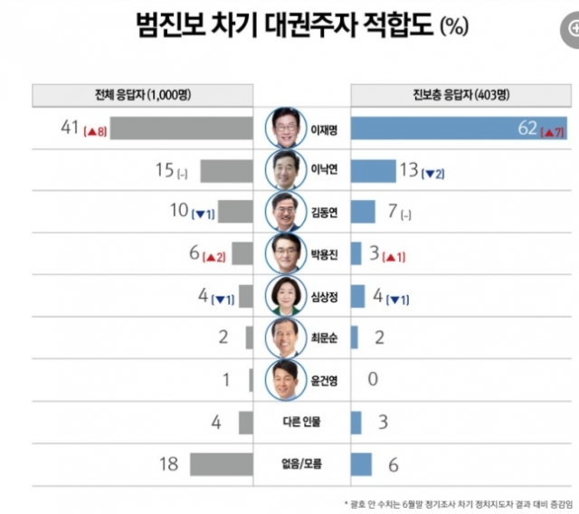 ¹üÁøº¸ Â÷±â Á¤Ä¡ÁöµµÀÚ ÀûÇÕµµ´Â ÀÌÀç¸í ÀÇ¿øÀÌ 41%·Î ¼±µÎ¿¡ ÀÚ¸®Çß´Ù. µÚ¸¦ ÀÌÀº À̳«¿¬ Àü ¹ÎÁÖ´ç ´ëÇ¥(15%)¿Í´Â µÎ ¹è ÀÌ»óÀÇ °ÝÂ÷´Ù. µÚ¸¦ ÀÌ¾î ±èµ¿¿¬ °æ±âÁö»ç(10%), ¹Ú¿ëÁø ¹ÎÁÖ´ç ÀÇ¿ø(6%), ½É»óÁ¤ Á¤ÀÇ´ç ÀÇ¿ø(4%) ¼øÀ¸·Î ³ªÅ¸³µ´Ù.