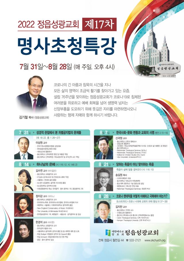 ½Å±¹¿ø ÃÑ½Å´ë ½ÅÇаú ¸í¿¹±³¼ö°¡ 7ÀÏ ¡®Çѱ¹»çȸ-¹®È º¯µ¿°ú ±³È¸ÀÇ »ç¸í¡¯À» ÁÖÁ¦·Î °¿¬ÇÑ °ÍÀ» ºñ·Ô, 14ÀÏ¿¡´Â ¡®Çϳª´ÔÀÇ ÀºÇý¡¯¸¦ ÁÖÁ¦·Î ±è¼ö¿¬ Á¤Áö° ÇѰ漮 ÃÑ½Å´ë ±³È¸À½¾Ç°ú ±³¼öµéÀÌ °£ÁõÇϰí Âù¾çÇÑ´Ù.