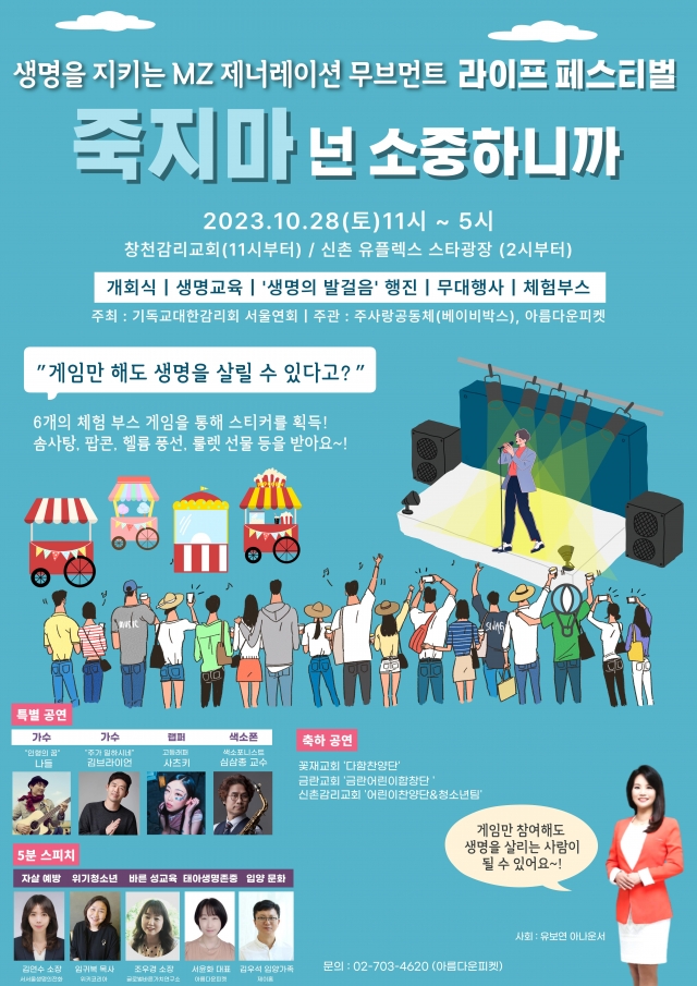 기독교대한감리회(기감) 서울연회(감독 이용원)가 주최하고 베이비박스 주사랑공동체(이종락 목사)와 아름다운피켓(서윤화 목사)이 주관하는 ‘생명을 지키는 MZ 제너레이션 무브먼트 라이프 페스티벌’이 오는 28일 서울 서대문구 창천감리교회와 신촌 유플렉스 스타광장에서 열린다.