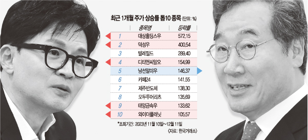 ÀÌ ¹Û¿¡µµ ÃÖ±Ù ÁÖ°¡ »ó½ÂÀ» À̲ö Á¾¸ñµéÀº ´ëºÎºÐ Á¤Ä¡ Å׸¶ÁÖ´Ù. ÇÑ ´Þ ¸¸¿¡ 400.54% ¿À¸¥ ´ö¼º ¿ì¼±ÁÖ¿Í µðƼ¾Ø¾¾¾Ë¿À(154.99%), žç±Ý¼Ó ¿ì¼±ÁÖ(133.62%), ¿ÍÀÌ´õÇ÷¡´Ö(105.57%) µîµµ ÇÑ Àå°ü Å׸¶ÁÖ·Î ºÐ·ùµÈ´Ù. ÇÑ Àå°üÀÌ ³»³â 4¿ù ÃѼ±¿¡ Ã⸶ÇÒ °ÍÀ¸·Î ¿¹»óµÇ¸é¼ °ü·Ã Å׸¶ÁÖµéÀÌ ±ÞµîÇÏ´Â »óȲÀÌ´Ù.