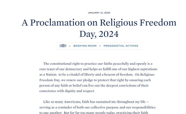 Á¶ ¹ÙÀÌµç ¹Ì±¹ ´ëÅë·ÉÀÌ ¿À´Â 16ÀÏÀ» Á¾±³ÀÚÀ¯Àdz¯(Religious Freedom Day)·Î ¼±Æ÷ÇÏ¸é¼ Àü ¼¼°è ¼ö¸¹Àº À̵éÀÌ ¿©ÀüÈ÷ ½Å¾ÓÀ» µû¸£´Â ÀÏ ¶§¹®¿¡ ¹ÚÇØ¸¦ ¹Þ°í ÀÖ´Ù°í ²¿Áý¾ú´Ù.