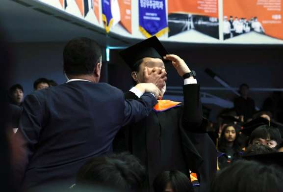 Àü³¯ Ä«À̽ºÆ®¿¡¼ ¿¸° 2024 ÇÐÀ§¼ö¿©½Ä¿¡¼± À± ´ëÅë·ÉÀÌ Ãà»ç¸¦ À̾´ø Áß°£¿¡ Á¹¾÷»ý ÇÑ ¸íÀÌ ¡®ºÎÀÚ °¨¼¼ Áß´ÜÇϰí R&D ¿¹»ê º¹¿øÇÏ¶ó¡¯°í ¾²ÀÎ Ç÷¡Ä«µå¸¦ µé°í ¡°R&D ¿¹»ê º¹¿øÇϽʽÿÀ! »ý»ö³»Áö ¸»°í R&D ¿¹»ê¡¦¡±À̶ó°í ¿ÜÃÆ¾ú´Ù. ´ëÅë·É °æÈ£¿øÀÌ Áï°¢ ÇØ´ç Á¹¾÷»ýÀÇ ÀÔÀ» Ʋ¾î¸·¾Ò°í, Á¦¾ÐÀÌ ½¬ÀÌ µÇÁö ¾ÊÀÚ °æÈ£¿ø ¿©·¯ ¸íÀÌ ºÙ¾î ±×ÀÇ »çÁö¸¦ µé°í Çà»çÀå ¹ÛÀ¸·Î ²ø¾î³Â´Ù.