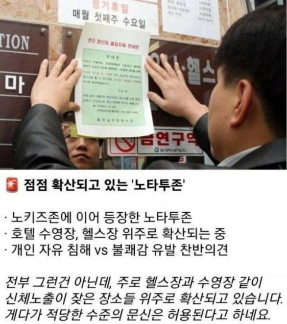 ³ëŸÅõÁ¸Àº ¸» ±×´ë·Î ¹®½ÅÀ» ÇÑ »ç¶÷µéÀÇ ÃâÀÔÀ» ±ÝÁöÇÏ´Â °ø°£ÀÌ´Ù. ÁÖ·Î ¹®½ÅÀÌ ÀÏ¹Ý »ç¶÷µé¿¡°Ô À§È°¨°ú °øÆ÷°¨À» Áشٴ ÀÌÀ¯·Î ÃâÀÔÀ» ±ÝÇϰí ÀÖ´Ù. ƯÈ÷ ÇコÀåÀ̳ª ¼ö¿µÀå µî ½Åü ³ëÃâÀÌ ¸¹Àº ¿µ¾÷ÀåµéÀÌ ÀÌ·± Á¤Ã¥À» ÅÃÇÑ °ÍÀ¸·Î ¾Ë·ÁÁ³´Ù.