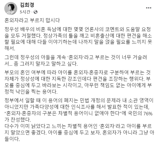 ±è Àü Â÷°üÀº À̳¯ ÀÚ½ÅÀÇ ÆäÀ̽ººÏ¿¡ ¡°Á¤¿ì¼ºÀÇ ¾ÆµéÀ» °è¼Ó ¡®È¥¿ÜÀÚ¡¯¶ó°í ºÎ¸£´Â °ÍÀÌ ³Ê¹« °Å½½·Á¼ Á» ±×·¯Áö ¸»ÀÚ°í ¸»ÇÏ°í ½Í´Ù¡±°í Àû¾ú´Ù. ±×´Â ¡°ºÎ¸ðÀÇ È¥ÀÎ ¿©ºÎ¿¡ µû¶ó ¾ÆÀ̸¦ È¥¿ÜÀÚ¡¤È¥ÁßÀÚ·Î ±¸ºÐÇÏ¿© ºÎ¸£´Â °Í ÀÚü°¡ Á¤»ó¼º¿¡ ´ëÇÑ Áöµ¶ÇÑ °Á¶ÀÎ µ¥´Ù Æí°ßÀ» Á¶ÀåÇÏ´Â ÇàÀ§¡±¶ó¸ç ¡°ºÎ¸ð¸¦ Á߽ɿ¡ µÎ°í ¹Ù¶óº¸´Â ½Ã°¢À̰í, ¾Æ¹«·± Ã¥ÀÓµµ ¾ø´Â ¾ÆÀÌ¿¡°Ô ºÎÁ¤Àû ³«ÀÎÀ» Âï´Â ¿ë¾î¡±¶ó°í ¼³¸íÇß´Ù.