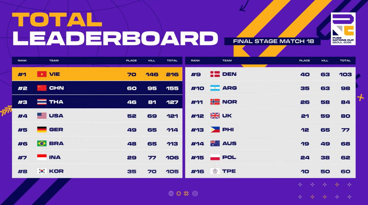 ű¹(127Á¡), ¹Ì±¹(121Á¡), µ¶ÀÏ(114Á¡), ºê¶óÁú(113Á¡), Àεµ³×½Ã¾Æ(106Á¡)ÀÌ 3~7À§¿¡ À̸§À» ¿Ã·È´Ù. ÇöÇà ·êÀÌ À¯ÁöµÈ´Ù¸é 8À§ Çѱ¹±îÁö ³»³â ÆÄÀ̳Π½ºÅ×ÀÌÁö¿¡ Á÷ÇàÇÑ´Ù.