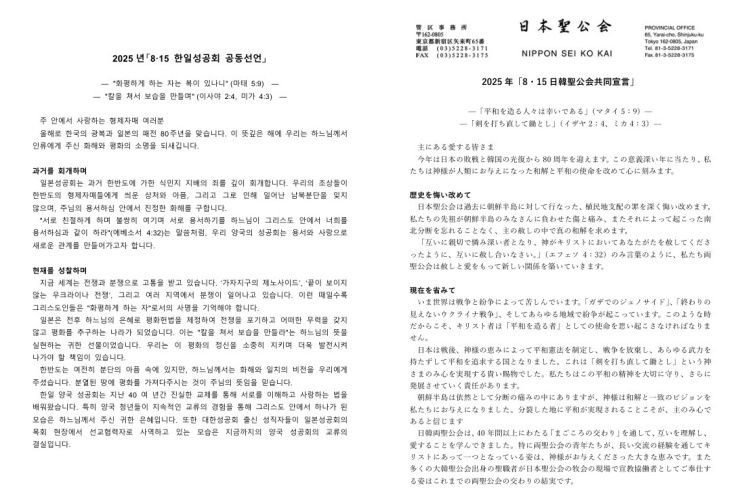 ÀϺ»¼º°øÈ¸´Â 10ÀÏ ±¹¹ÎÀϺ¸°¡ ÀÔ¼öÇÑ ¡®2025³â 8¡¤15 ÇÑÀϼº°øÈ¸ °øµ¿¼±¾ð¹®¡¯¿¡¼ ¡°°ú°Å Çѹݵµ¿¡ °¡ÇÑ ½Ä¹ÎÁö Áö¹èÀÇ Á˸¦ ±íÀÌ È¸°³ÇÑ´Ù¡±¸ç ¡°¿ì¸®ÀÇ Á¶»óµéÀÌ ÇѹݵµÀÇ ÇüÁ¦Àڸŵ鿡°Ô ¾º¿î »óó¿Í ¾ÆÇÄ, ±×¸®°í ±×·Î ÀÎÇØ ÀÏ¾î³ ³²ºÏºÐ´ÜÀ» ÀØÁö ¾ÊÀ¸¸ç, ÁÖ´ÔÀÇ ¿ë¼ÇÏ½É ¾È¿¡¼ ÁøÁ¤ÇÑ ÈÇØ¸¦ ±¸ÇÑ´Ù¡±°í ¹àÇû´Ù. ÀÌ¿¡ ´ëÇѼº°øÈ¸´Â ¡°¡®¼·Î Ä£ÀýÇÏ°Ô ÇÏ¸ç ºÒ½ÖÈ÷ ¿©±â¸ç ¼·Î ¿ë¼Çϱ⸦ ÇÏ´À´ÔÀÌ ±×¸®½ºµµ ¾È¿¡¼ ³ÊÈñ¸¦ ¿ë¼ÇϽɰú °°ÀÌ Ç϶ó¡¯(¿¡º£¼Ò¼ 4:32)´Â ¸»¾¸Ã³·³, ¿ì¸® ¾ç±¹ÀÇ ¼º°øÈ¸´Â ¿ë¼¿Í »ç¶ûÀ¸·Î »õ·Î¿î °ü°è¸¦ ¸¸µé¾î°¡°íÀÚ ÇÑ´Ù¡±´Â ¶æÀ» ÀüÇß´Ù.