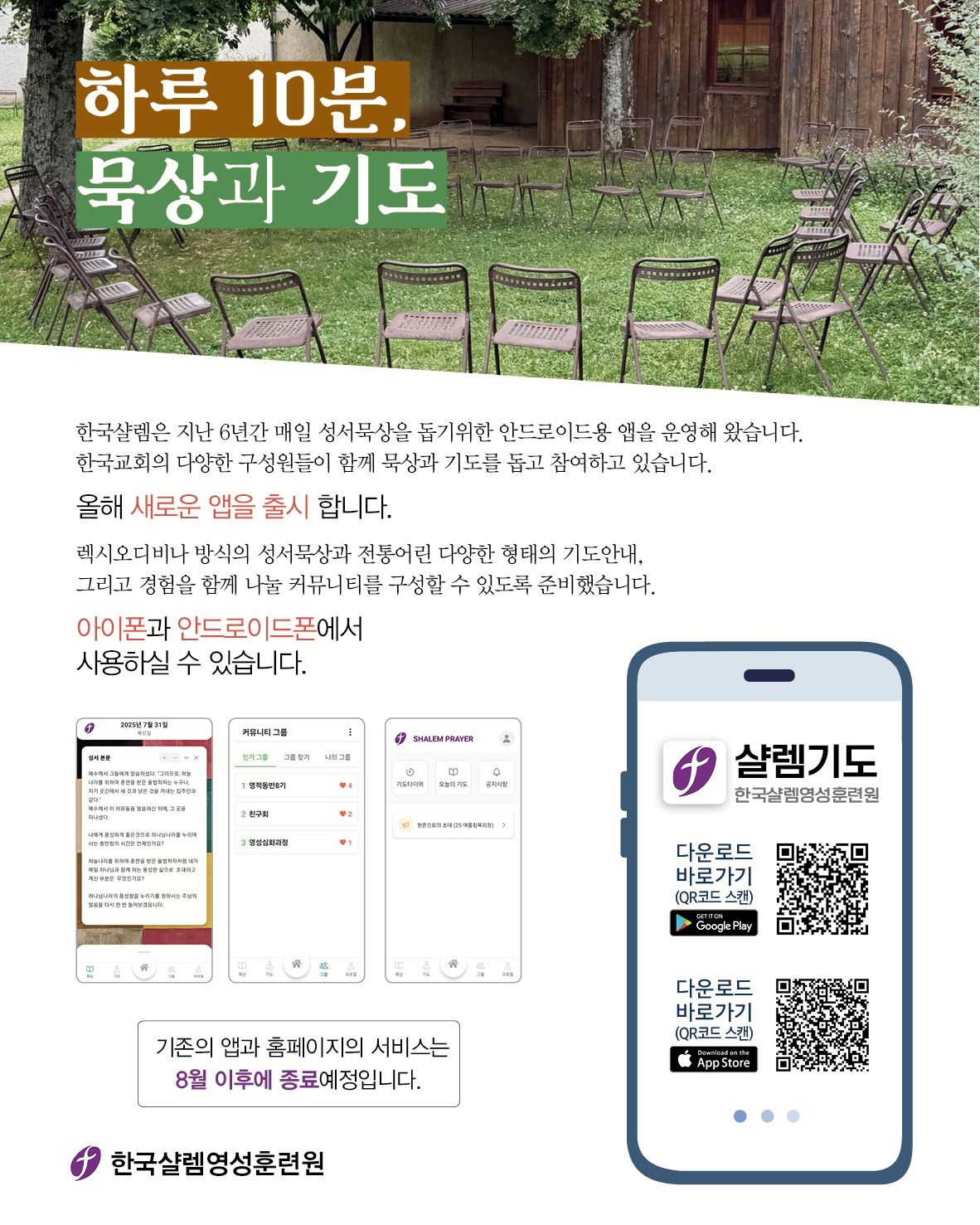 기독교 영성 훈련 단체 한국샬렘영성훈련원(원장 김홍일 신부)이 성경 묵상 애플리케이션을 새로 선보였다. 이름은 ‘샬렘기도’로 아이폰과 안드로이드폰에서 모두 이용할 수 있다. 기존 앱과 웹사이트는 8월 이후 종료된다.