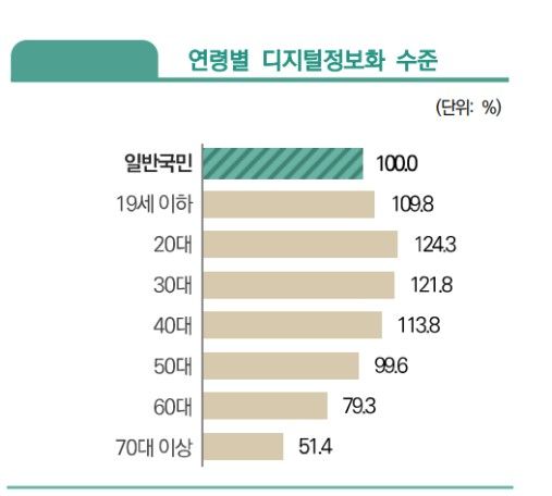 °í·ÉÃþÀÌ Àϻ󿡼 °Þ´Â µðÁöÅÐ °ÝÂ÷´Â Åë°è·Îµµ È®ÀεȴÙ. Çѱ¹Áö´ÉÁ¤º¸»çȸÁøÈï¿øÀÌ Áö³ 3¿ù ¹ßÇ¥ÇÑ ¡®2024 µðÁöÅÐ Á¤º¸ °ÝÂ÷ ½ÇÅÂÁ¶»ç º¸°í¼¡¯¿¡ µû¸£¸é °í·ÉÃþÀº Á¤º¸ Ãë¾à 4´ë °èÃþ(Àå¾ÖÀΡ¤°í·ÉÃþ¡¤Àú¼ÒµæÃþ¡¤³ó¾î¹Î) °¡¿îµ¥¿¡¼µµ °¡Àå µÚóÁö°í ÀÖ¾ú´Ù. °í·ÉÃþÀÇ µðÁöÅÐ Á¤º¸È ¿ª·® ¼öÁØÀº ÀÏ¹Ý ±¹¹ÎÀÇ 55.9%·Î, ³ó¾î¹Î(71.8%) Àå¾ÖÀÎ(76.1%) Àú¼ÒµæÃþ(93.3%)º¸´Ù Å©°Ô ³·¾Ò´Ù. ¿¬·Éº° µðÁöÅÐÁ¤º¸È ¼öÁØÀº 70´ë ÀÌ»ó 51.4%, 60´ë 79.3%, 50´ë 99.6% ¼øÀ¸·Î ÆÄ¾ÇµÆ´Ù.(±×·¡ÇÈ ÂüÁ¶)