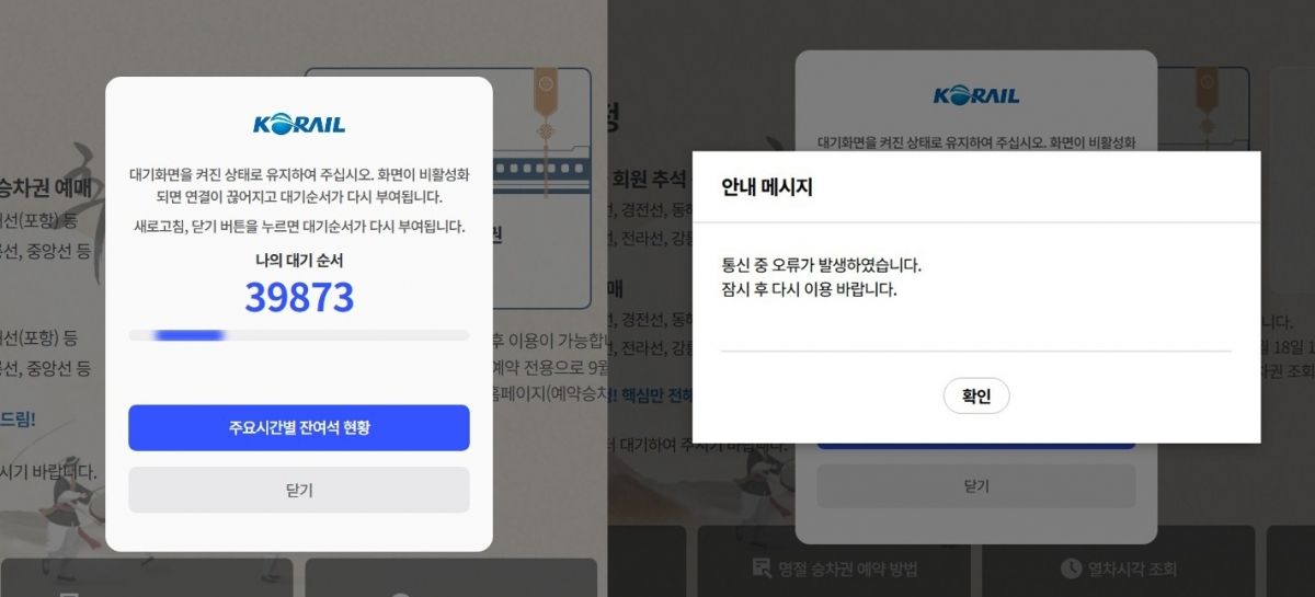 Ãß¼® ¿¬ÈÞ ½ÂÂ÷±Ç ¿¹¸Å°¡ ½ÃÀÛµÈ 17ÀÏ ¿ÀÀü Çѱ¹Ã¶µµ°ø»ç(ÄÚ·¹ÀÏ) °ø½Ä ¾Û°ú À¥»çÀÌÆ® Á¢¼ÓÀÌ ¸ô¸®¸é¼ Áö¿¬ÀÌ ¹ß»ýÇϰí ÀÖ´Ù. ÀÌ¿¡ ÄÚ·¹ÀÏÀº ½ÂÂ÷±Ç ¿¹¸Å½Ã°£À» ±âÁ¸º¸´Ù 3½Ã°£ ´Ã¸®±â·Î Çß´Ù.