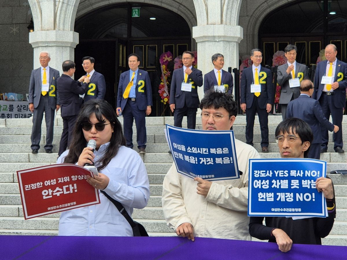 ÃÑȸÀå ¿ÜºÎ¿¡¼´Â ¿©¼º ¾È¼ö¸¦ ¿øÇÏ´Â ÃÑ½Å´ë¿ø¿©µ¿¹®È¸(ȸÀå ¹Ú°æ¼ø Àüµµ»ç)ÀÇ ±âÀÚȸ°ßµµ ÁøÇàµÆ´Ù. ¿©µ¿¹®È¸ ȸ¿øµéÀº ¡°³²³àÂ÷º° ¾ø´Â °µµ±ÇÀ» ¿øÇÑ´Ù¡±°í ¿äûÇß´Ù.