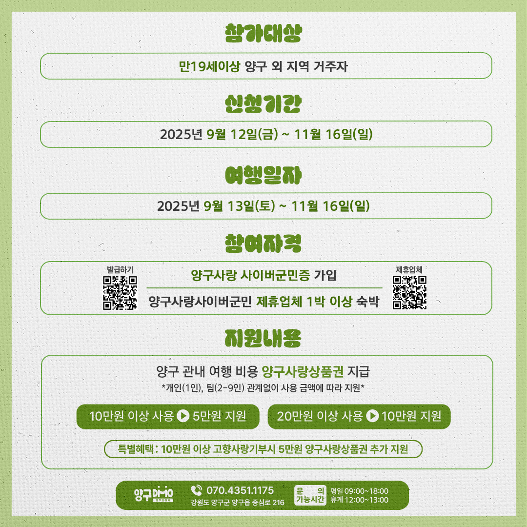 지원 대상은 양구사랑사이버군민증 제휴 숙박업체 숙박비, 관광지 입장료 및 체험비, 식비, 로컬푸드 매장에서의 특산품 구매비 등으로 폭넓게 구성했다.
