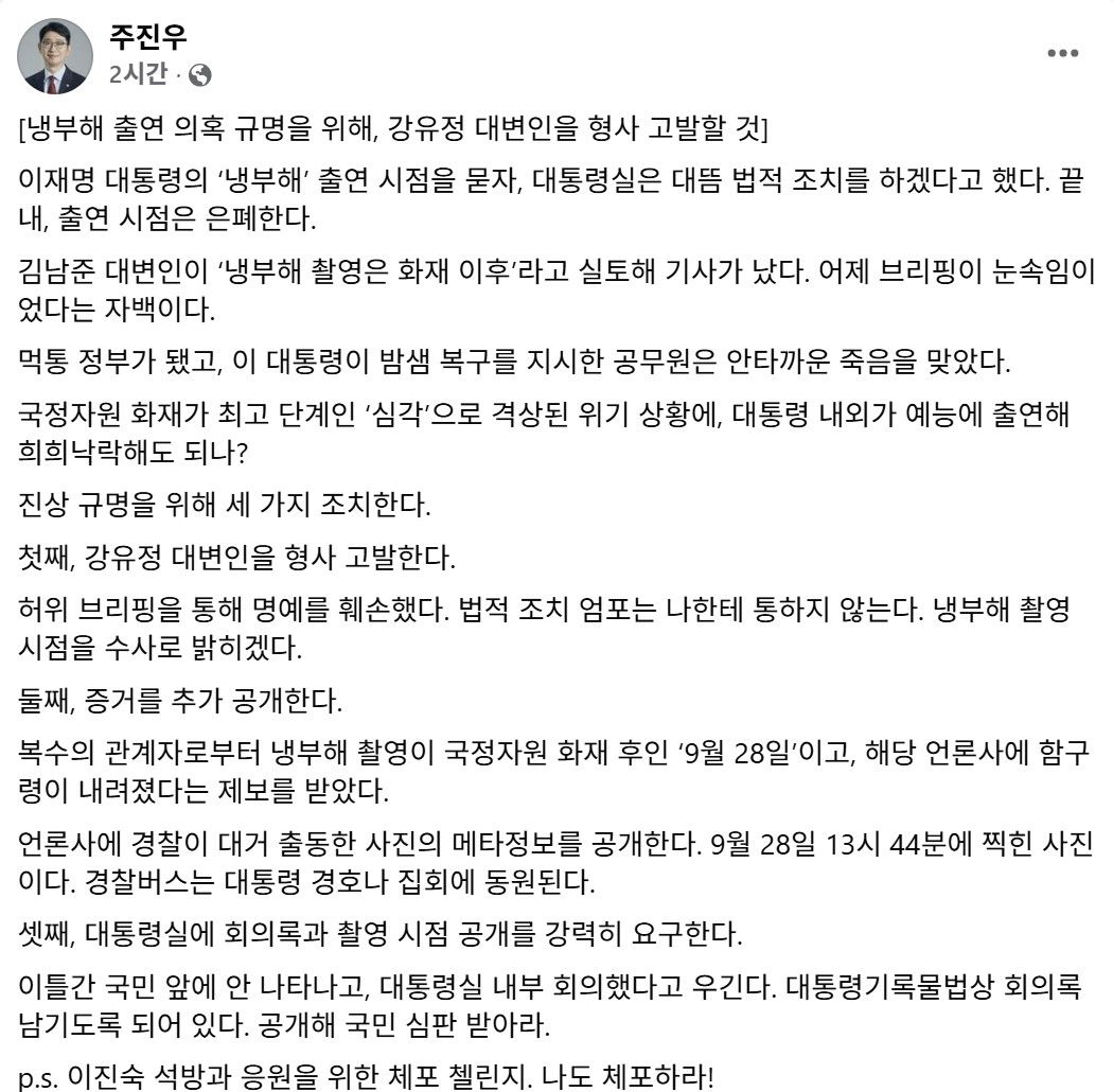 ÁÖÁø¿ì ±¹¹ÎÀÇÈû ÀÇ¿øÀÌ ÀÌÀç¸í ´ëÅë·É°ú ±èÇý°æ ¿©»ç°¡ ´ëÀü ±¹°¡Á¤º¸ÀÚ¿ø°ü¸®¿ø(±¹Á¤ÀÚ¿ø) ÈÀç°¡ ¹ß»ýÇÑ ÀÌÈÄ JTBC ¿¹´ÉÇÁ·Î±×·¥ ¡®³ÃÀå°í¸¦ ºÎÅ¹ÇØ¡¯(³ÃºÎÇØ)¸¦ ÃÔ¿µÇß´Ù°í ÀçÂ÷ ÁÖÀåÇÏ¸ç °ü·Ã Áõ°Å¸¦ Ãß°¡·Î °ø°³Çß´Ù. ¹ýÀû ´ëÀÀ °±¸¸¦ ¿¹°í ¹ßÇ¥ÇÑ ´ëÅë·É½Ç¿¡ ¡°¸Â´ëÀÀÇÑ´Ù¡±°íµµ ¹àÇû´Ù.