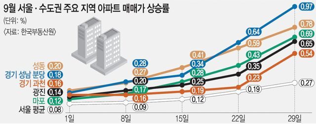 ÀÌó·³ ÇѰº§Æ® Áý°ªÀÌ ¿äµ¿Ä¡¸é¼ Ãß¼® ÀÌÈÄ Á¤ºÎ°¡ Ãß°¡ ±ÔÁ¦Ã¥À» ¹ßÇ¥ÇÒ °ÍÀ̶õ Àü¸Á¿¡ ÈûÀÌ ½Ç¸®°í ÀÖ´Ù. Çѱ¹ºÎµ¿»ê¿ø ÁÖ°£ µ¿Çâ ±âÁØ 6¿ù 30ÀϺÎÅÍ 9¿ù 29ÀϱîÁö ÃÖ±Ù 3°³¿ù°£ ¾ÆÆÄÆ® ¸Å¸Å°¡°Ý »ó½Â·üÀº ¼¿ï ¼ºµ¿±¸(5.01%), °æ±â ¼º³² ºÐ´ç±¸(4.99%), °æ±â °úõ½Ã(3.81%), ¼¿ï ±¤Áø±¸(3.57%), ¼¿ï ¸¶Æ÷±¸(3.17%), ¼¿ï ¾çõ±¸(2.88%) µî ¼øÀ¸·Î ³ô¾Ò´Ù. ÀÌ¿¡ ¼¿ï ¼ºµ¿±¸¿Í ¸¶Æ÷±¸¸¦ ºñ·ÔÇÑ ÇѰº§Æ® ±Ç¿ª ¹× °æ±â ¼º³²½Ã ºÐ´ç±¸ µî °¡°Ý ¿À¸§ÆøÀÌ µÎµå·¯Áö´Â Áö¿ªÀ» ±ÔÁ¦Áö¿ª(Á¶Á¤´ë»óÁö¿ª¡¤Åõ±â°ú¿Áö±¸¡¤Åõ±âÁö¿ª)À¸·Î ¹Àº µÚ ÃßÈÄ ÅäÇ㱸¿ªÀ¸·Î ÁöÁ¤ÇÏ´Â ¹æ¾ÈÀÌ À¯·ÂÇÏ°Ô °Å·ÐµÇ°í ÀÖ´Ù.