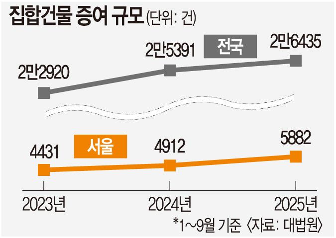 14ÀÏ ´ë¹ý¿ø µî±âÁ¤º¸±¤Àå¿¡ µû¸£¸é ¿ÃÇØ 1~9¿ù±îÁö Àü±¹ÀÇ ÁýÇհǹ° Áõ¿© °Ç¼ö´Â ÃÑ 2¸¸6435°ÇÀ¸·Î Áý°èµÆ´Ù. ÀÌ´Â Áö³ÇØ °°Àº ±â°£(2¸¸5391°Ç) ´ëºñ 4.1%(1044°Ç) ´Ã¾î³ °ÍÀÌÀÚ ÃÖ±Ù 3³â Áß °¡Àå ¸¹Àº ¾çÀÌ´Ù. 9¿ù ºÎµ¿»ê °Å·¡ ½Å°í ±âÇÑÀÌ ÀÌ´Þ ¸»±îÁöÀÓÀ» °í·ÁÇÏ¸é °Ç¼ö´Â ´õ ´Ã¾î³¯ ¼ö ÀÖ´Ù.