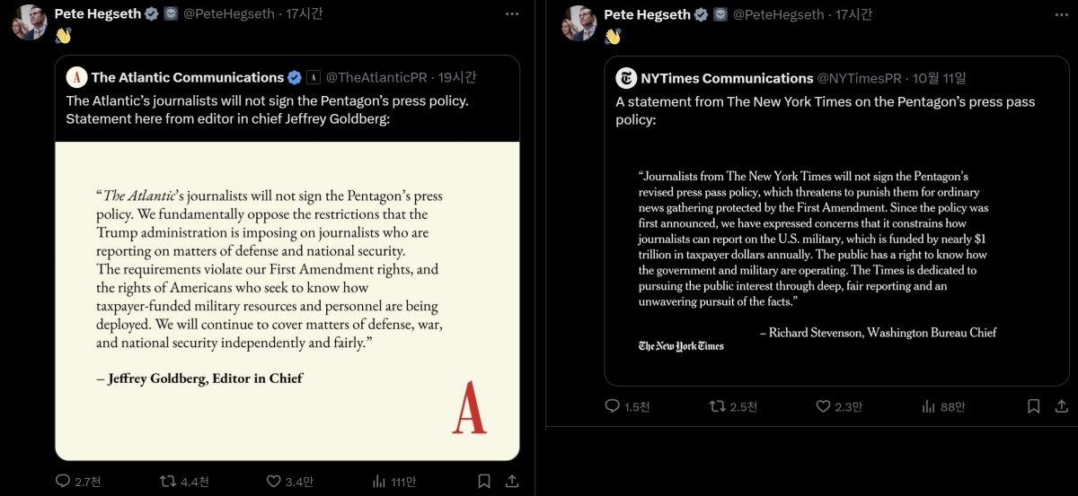 ÀÌµé ´ëºÎºÐÀº ¼Ò¼È¹Ìµð¾î¿¡ ÀÔÀå¹®À» ¿Ã·È´Âµ¥, Çì±×¼¼½º Àå°üÀº ÀϺΠ°Ô½Ã¹°¿¡ ¼ÕÀ» Èçµå´Â ¸ð¾çÀÇ ¡®±Â¹ÙÀÌ À̸ðƼÄÜ¡¯À¸·Î ¹ÝÀÀÇß´Ù. ¹Ì±¹ ¼öÁ¤Çå¹ý Á¦1Á¶°¡ º¸ÀåÇÏ´Â ¾ð·ÐÀÇ ÀÚÀ¯¸¦ ÈѼÕÇÑ´Ù°í ºñÆÇÇÑ NYT¿Í WP, ¡°¿ì¸®´Â ÀÌ·¯ÇÑ Á¦ÇÑÀ» ±Ùº»ÀûÀ¸·Î ¹Ý´ëÇÑ´Ù¡±°í ¹àÈù ¾ÖƲ·£Æ½ µîÀÇ ¼Ò¼È¹Ìµð¾î °Ô½Ã¹°¿¡ ÀÌ À̸ðƼÄÜÀ» ³²°å´Ù.