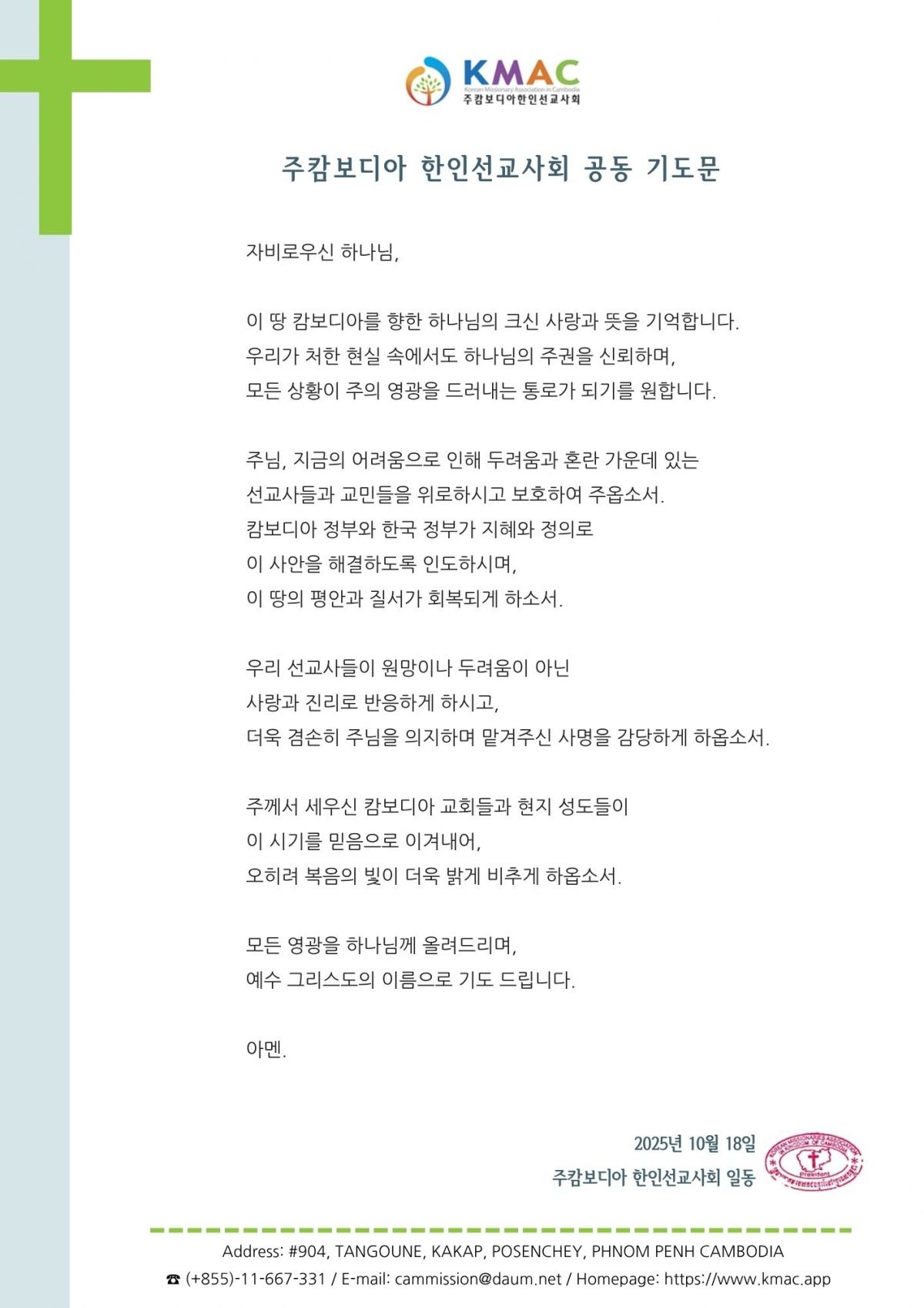 ¸¶Áö¸·À¸·Î įº¸µð¾Æ¿ÍÀÇ °ü°è ȸº¹À» À§ÇÑ ÀÇÁö¸¦ ´ã¾Ò´Ù. KMAC´Â ¡°¿ì¸®´Â Áö±Ý±îÁö įº¸µð¾Æ ¼±±³¸¦ À§ÇØ Çå½ÅÇØ ¿Ô´Ù. ¾ÕÀ¸·Îµµ º¯ÇÔ¾øÀÌ Ä¯º¸µð¾Æ ±¹¹ÎÀ» »ç¶ûÇÏ°í ±×µé°úÀÇ ½Å·Ú °ü°è¸¦ ¼ÒÁßÈ÷ ÁöÄѳª°¥ °Í¡±À̶ó°í °Á¶Çß´Ù. ƯÈ÷ ´ëÇѹα¹°ú įº¸µð¾Æ ¾ç±¹ÀÇ ¿ìÈ£Àû °ü°è°¡ ´õ¿í ±»°ÇÈ÷ ȸº¹µÇµµ·Ï Áö¼ÓÇØ¼ ³ë·ÂÇÒ °ÍÀ» ´ÙÁüÇß´Ù.