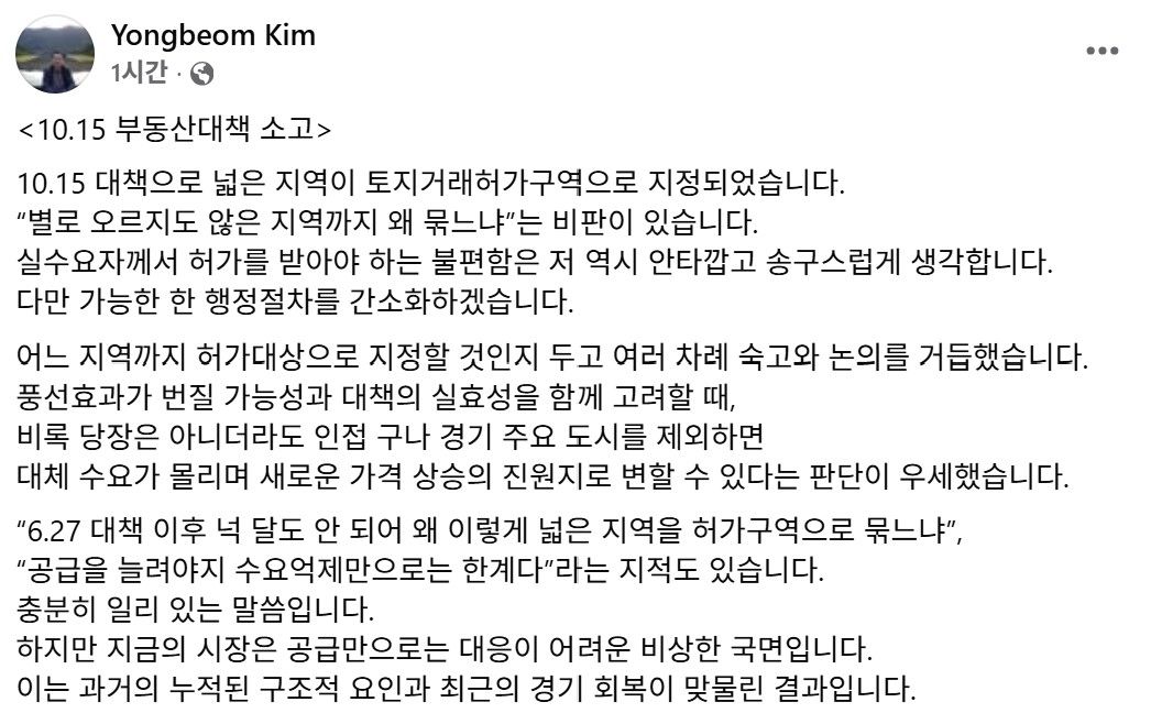 ±è ½ÇÀåÀº À̳¯ ¹ã ÀÚ½ÅÀÇ ÆäÀ̽ººÏ¿¡ ¿Ã¸° ¡®10¡¤15 ºÎµ¿»ê ´ëÃ¥ ¼Ò°í¡¯¶ó´Â Á¦¸ñÀÇ ±Û¿¡¼ ¡°10¡¤15 ´ëÃ¥À¸·Î ³ÐÀº Áö¿ªÀÌ ÅäÁö°Å·¡Çã°¡±¸¿ªÀ¸·Î ÁöÁ¤µÆ´Ù. ¡®º°·Î ¿À¸£Áöµµ ¾ÊÀº Áö¿ª±îÁö ¿Ö ¹´À³Ä¡¯´Â ºñÆÇÀÌ ÀÖ´Ù¡±¸ç À̰°ÀÌ ¸»Çß´Ù.