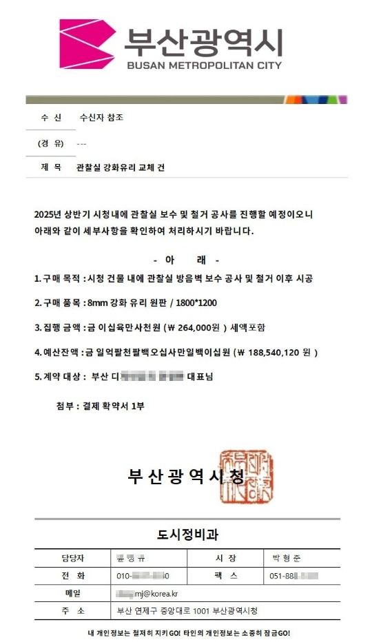 ¹®¼¿¡´Â ¡®2025³â »ó¹Ý±â ½Ãû ³» °üÂû½Ç º¸¼ö ¹× ö°ø °ø»ç ¿¹Á¤¡¯À̶ó´Â ¹®±¸¿Í ÇÔ²² ÁýÇà±Ý¾× 26¸¸4000¿ø, ¿¹»ê ÀÜ¾× 1¾ï8854¸¸120¿ø µî ±¸Ã¼ÀûÀÎ ¼öÄ¡°¡ ÀûÇô ÀÖ¾ú´Ù. ´Ù¸¸ ÀÌ ±Ý¾×ÀÌ ½ÇÁ¦ ÇÇÇØ·Î À̾îÁ³´ÂÁö´Â È®ÀεÇÁö ¾Ê¾Ò´Ù. ½ÇÁ¦ ºÎ»ê½Ã ³»ºÎ °ø¹®¼ ¾ç½Ä°ú´Â ÀüÇô ´Ù¸¥ ÇüÅ¿´Áö¸¸, ¼·ù »ó´Ü¿¡´Â ºÎ»ê½Ã ¸¶Å©°¡, ÇÏ´Ü¿¡´Â ½ÃÀå À̸§°ú ºÎ¼ ´ã´çÀÚ Á÷ÇÔ, ½Ãû Á÷ÀÎÀÌ ÂïÇô ÀÖ¾î ÀϹÝÀÎ ÀÔÀå¿¡¼´Â ½ÇÁ¦ °ø¹®°ú °ÅÀÇ ±¸º°ÀÌ ¾î·Á¿ü´Ù.
