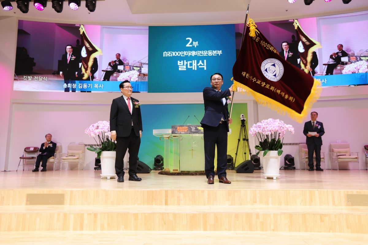 ´ëÇÑ¿¹¼ö±³Àå·Îȸ(¿¹Àå) ¹é¼®ÃÑȸ(ÃÑȸÀå ±èµ¿±â ¸ñ»ç)°¡ ±³´Ü »êÇÏ 1¸¸ ±³È¸ÀÇ ³»½ÇÀ» ´ÙÁö°í 1¸¸5000 ±³È¸·Î ºÎÈïÇÏ´Â °ÍÀ» ¸ñÇ¥·Î ÇÏ´Â ¡®¹é¼® 100ÀÎ ¹Ì·¡ºñÀü¿îµ¿¡¯À» °ø½Ä Ãâ¹üÇß´Ù.