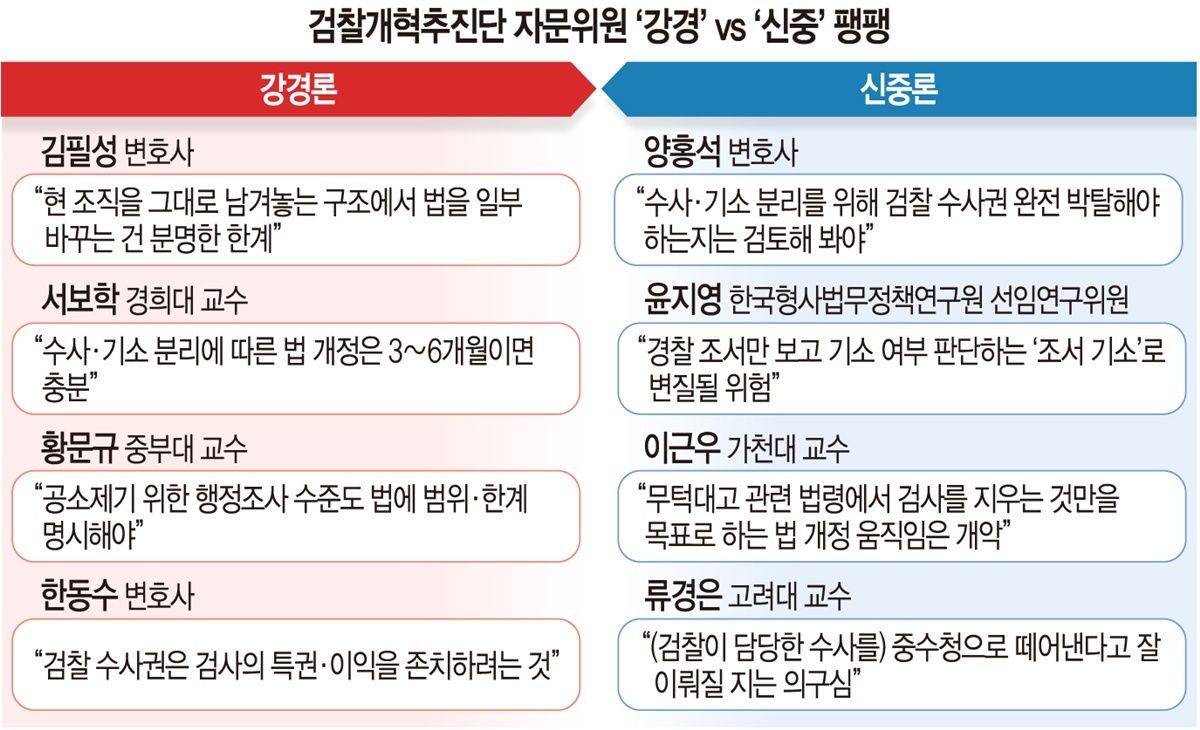 ±¹¹«ÃѸ® »êÇÏ °ËÂû°³ÇõÃßÁø´ÜÀÌ ²Ù¸° ÀÚ¹®À§¿øÈ¸°¡ ¿©±ÇÀÌ ÃßÁøÇÏ´Â °ËÂû°³Çõ¿¡ °ÇÏ°Ô Âù¼ºÇÏ´Â À§¿øµé°ú ½ÅÁßÇÑ ÀÔÀåÀ» ÃëÇÏ´Â À§¿øµé·Î ¾çºÐµÈ °ÍÀ¸·Î ³ªÅ¸³µ´Ù. ¡®°°æ·Ð¡¯°ú ¡®½ÅÁ߷С¯ Àλ簡 ÃÖ¼Ò 4¸í¾¿ Æ÷ÁøµÅ °ËÂûû ÆóÁö ÈÄ¼Ó ÀÔ¹ýÀ» µÑ·¯½Ñ °Ý·ÐÀÌ ÆîÃÄÁú °ÍÀ¸·Î Àü¸ÁµÈ´Ù. ÀÚ¹®À§´Â ³»³â 9¿ù 30ÀϱîÁö °ËÂû°³ÇõÀÇ ÁÖ¿ä ÀïÁ¡°ú ´ë¾ÈÀ» Á¦½ÃÇÏ´Â °úÁ¤¿¡¼ ¡®´Ü¼ø ÀÚ¹®¿ª¡¯ ÀÌ»óÀÇ ¿ªÇÒÀ» ÇÒ °ÍÀ¸·Î º¸ÀδÙ.